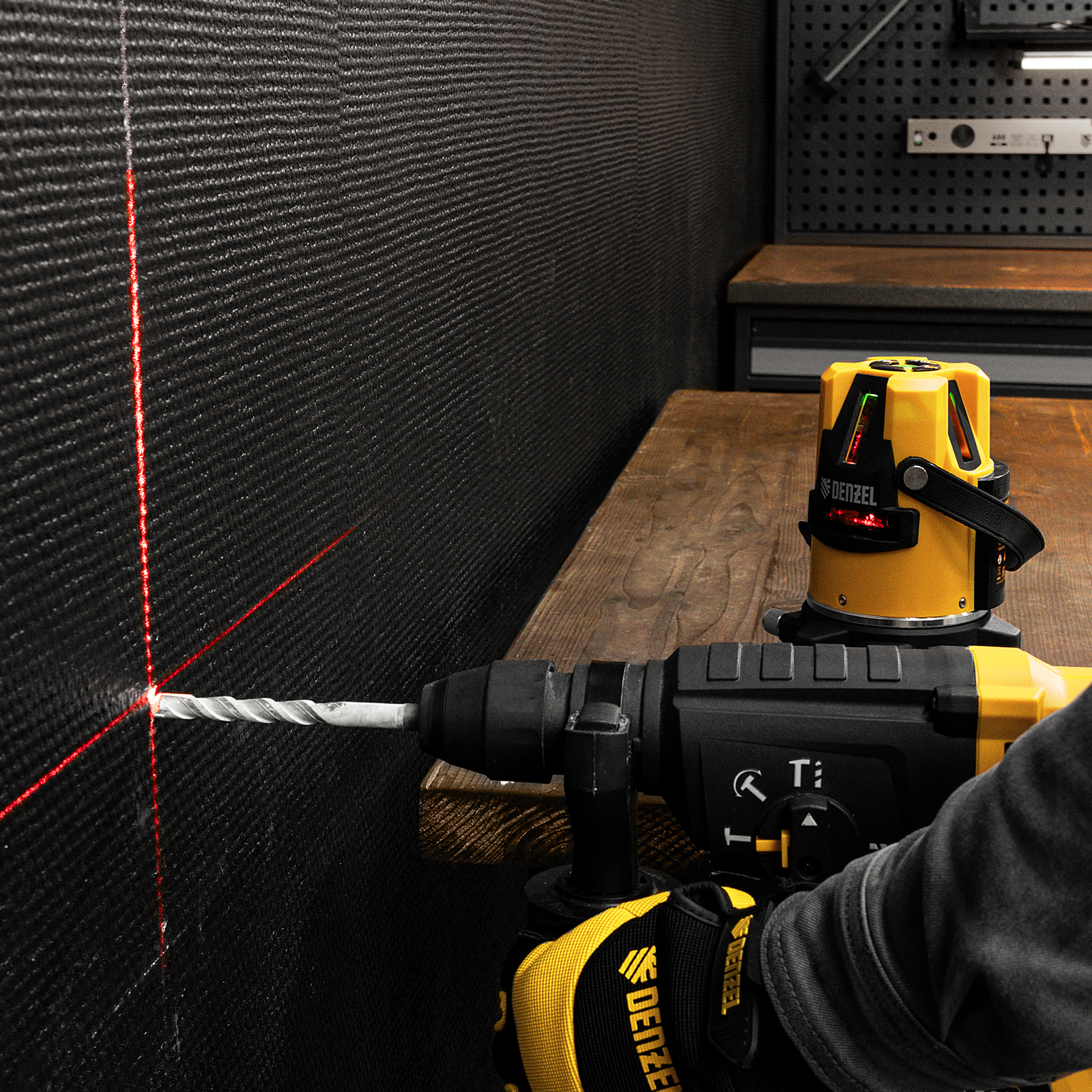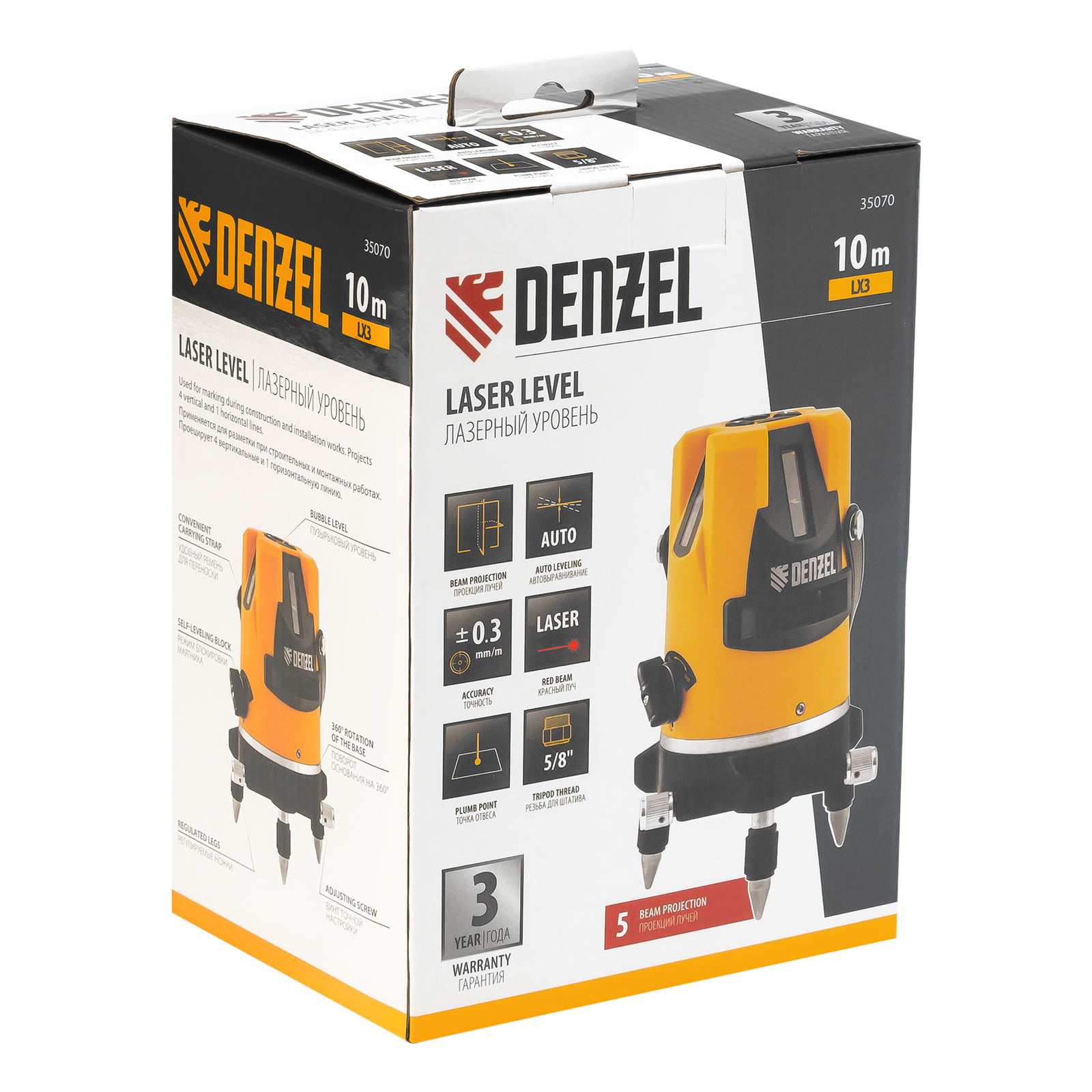 Лазерный уровень Denzel LX3 35070 с резьбой 5/8" под штатив имеет точность ±0,3 мм/1 м и проецирует точку отвеса, 4 вертикальных и 1 горизонтальную линию на расстояние до 10 м при помощи красных лучей 635 нм. Используется для построения разметки на стенах, полу и потолке. Пригодится во время укладки плитки, монтажа подвесных потолков, установки оконных рам, а также проведения других ремонтных и отделочных работ.
