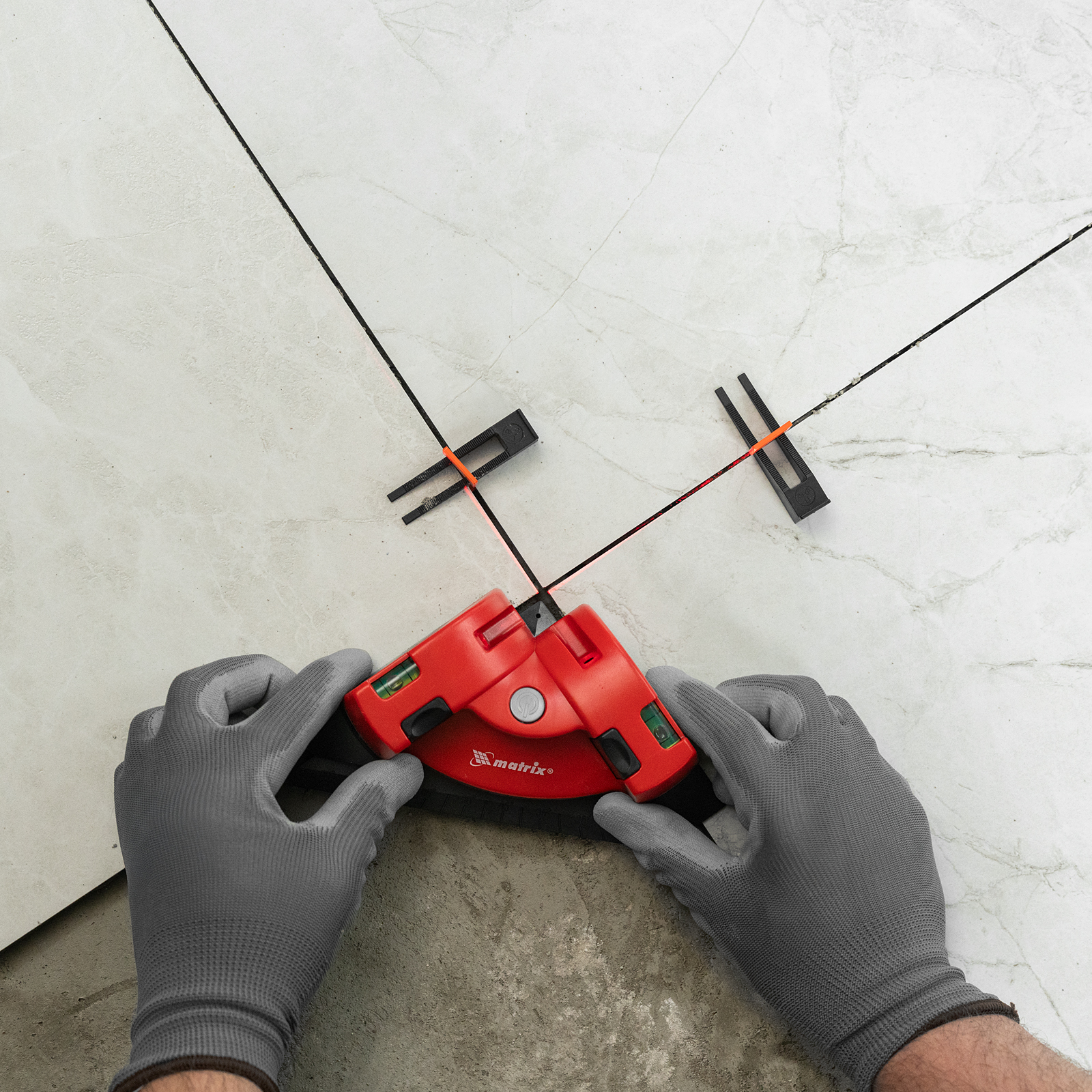 Лазерный уровень Matrix 35007 в форме угольника предназначен для разметки поверхностей по горизонтали, вертикали и диагонали. Проецирует 2 лазерные линии под углом 90 градусов на поверхность, параллельно которой он установлен. Угловая форма позволяет использовать инструмент для укладки покрытия на полу, например, ламината, паркета или плитки, или для отделки стен, планировки розеток и выравнивания конструкций.