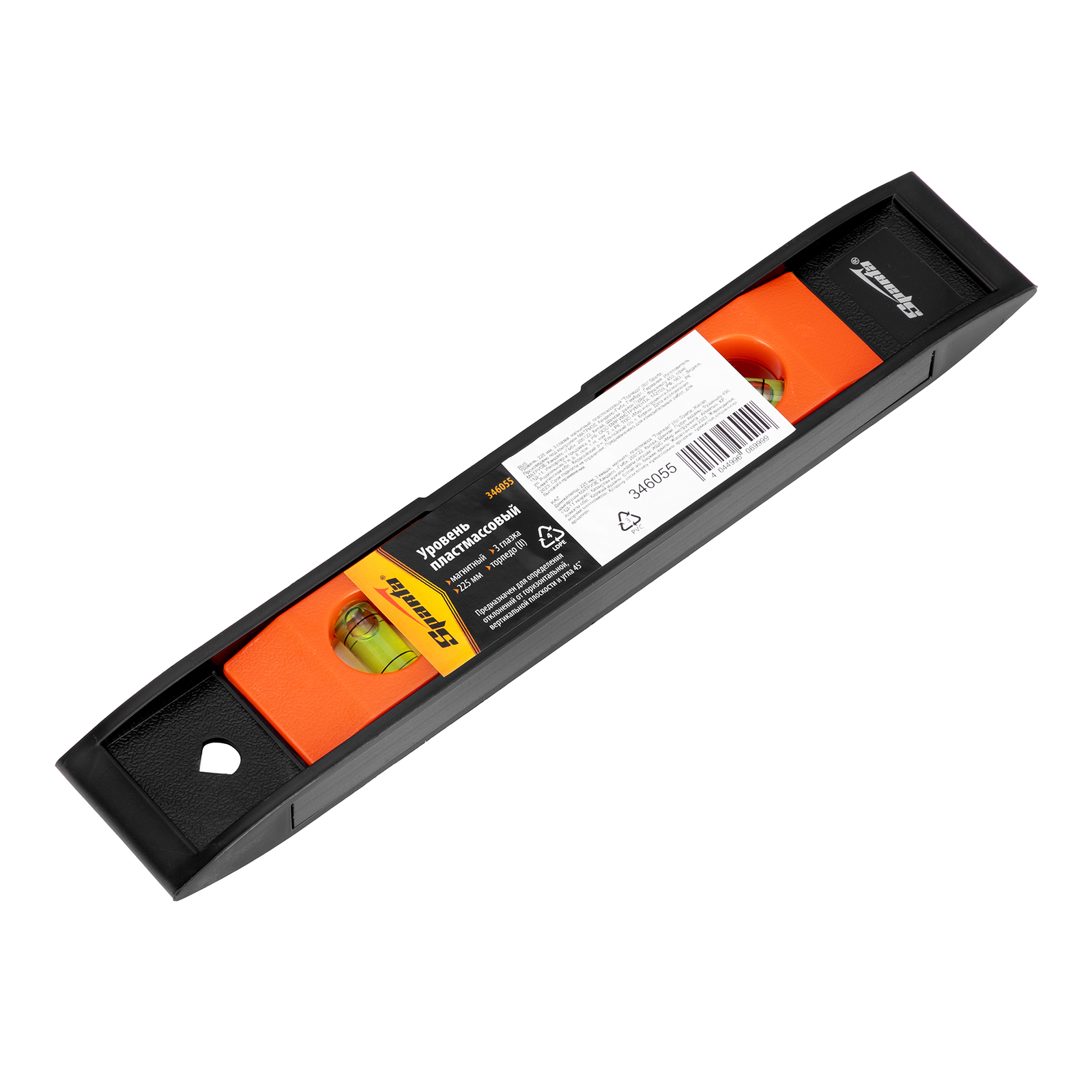 Пластмассовый магнитный уровень Sparta «Торпедо» (II) 346055 длиной 225 мм, с 3 глазками, используется для контроля соответствия поверхностей вертикальной и горизонтальной плоскостям, а также углу 45°. Компактный инструмент удобен для работы в труднодоступных местах.