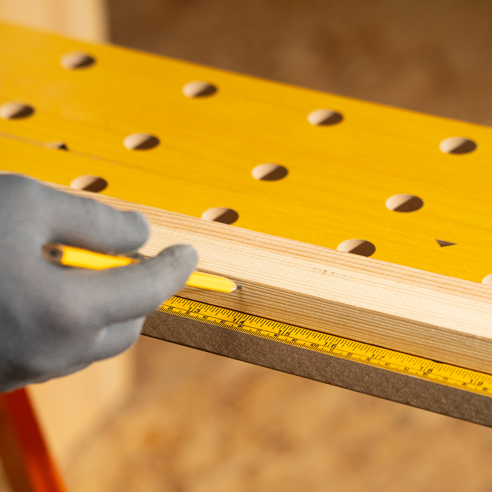 - Удобная эксплуатация — верстак снабжен 4 съемными упорами, которые устанавливаются в различных позициях, а на столешнице имеется разметка с линейкой и транспортиром.