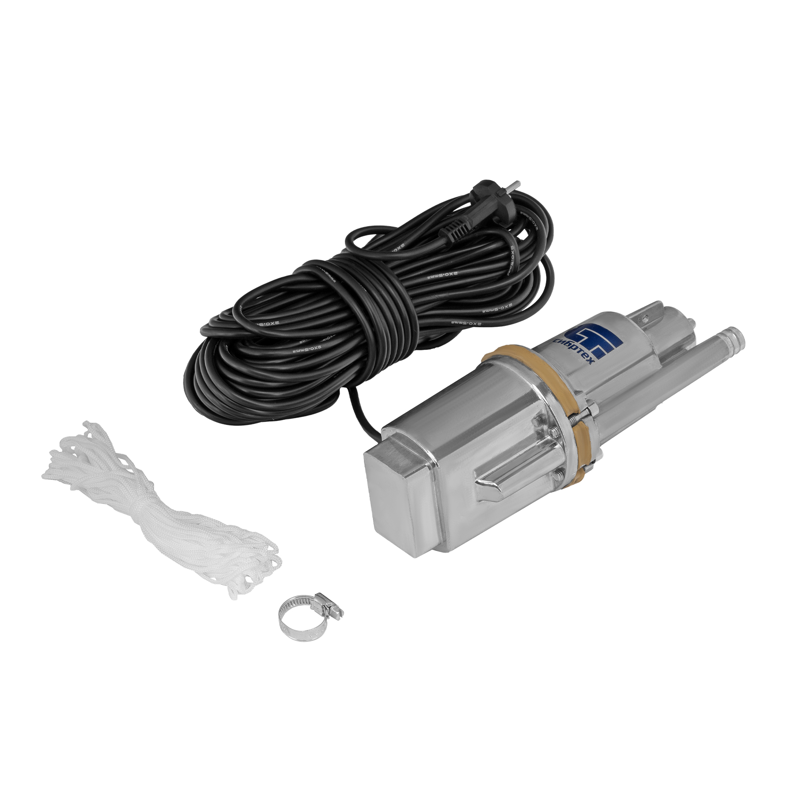 - Продуманная комплектация — трос для установки и хомут для шланга прилагаются к насосу.