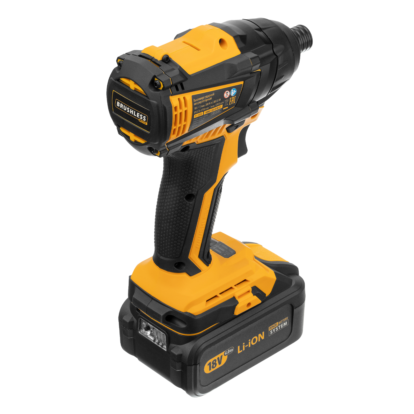 Ударный аккумуляторный винтоверт Denzel CID-IB-200 26510 с бесщеточным двигателем работает от батареи Li-Ion с рабочим напряжением 18 В и предназначен для завинчивания и отвинчивания винтов и шурупов, а также затягивания и откручивания гаек. Эффективен для демонтажа перетянутого и закисшего крепежа, закручивания длинных болтов и шурупов. Пригодится для сборки мебели и различных конструкций.,Аккумуляторный винтоверт не зависит от стационарного источника энергии. Интеллектуальная батарея емкостью 4 А/ч с защитой от перезаряда и глубокого разряда не имеет эффекта памяти, благодаря чему обеспечивает стабильную работу инструмента на протяжении длительного времени.