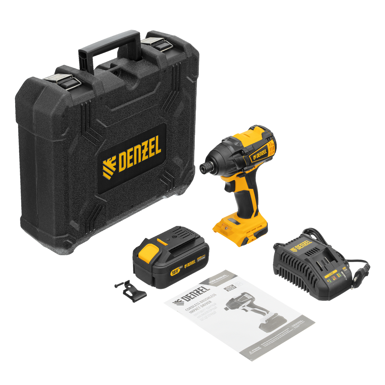 - Универсальность — к инструменту подойдут любые 18 В аккумуляторы Denzel battery system