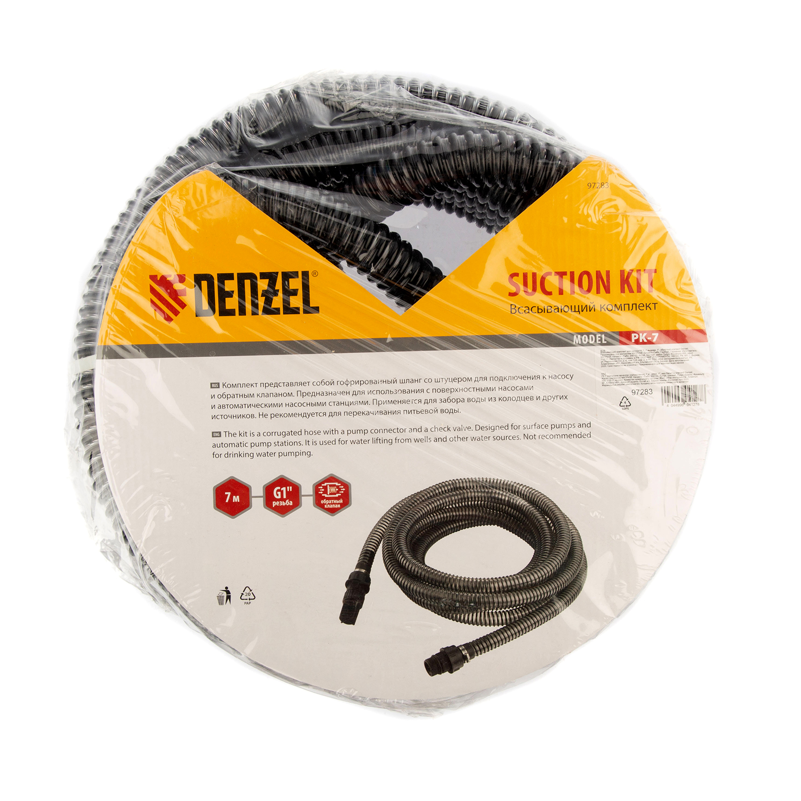 Всасывающий комплект Denzel РК 7 97283 с присоединительным диаметром 1 дюйм, со шлангом длиной 7 м м обратным клапаном, используется с поверхностными насосами и автоматическими насосными станциям Denzel. Благодаря встроенному фильтру, очищающему поступающую воду, ее можно набирать не только из искусственных резервуаров, но и из естественных водоемов.