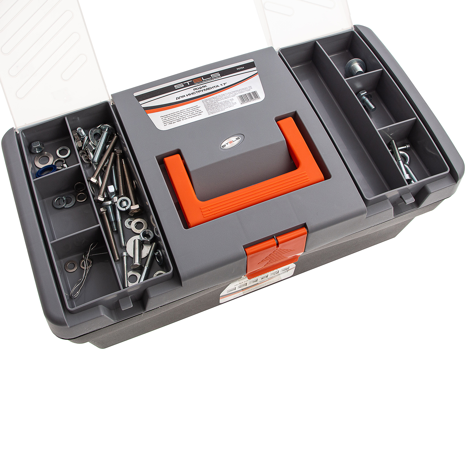 Ящик для инструмента Stels 90704 из пластика, длиной 17", габаритами 420 х 220 х 180 мм, предназначен для переноски и хранения инструментов, хозяйственных мелочей, рыболовных снастей. Крышка надежно закрывается, поэтому содержимое не рассыплется. Встроенные в крышку отделения обеспечивают быстрый доступ к крепежам и другим необходимым предметам. Большой ящик для хранения инструментов будет полезен дома, на даче, в гараже и на рыбалке.