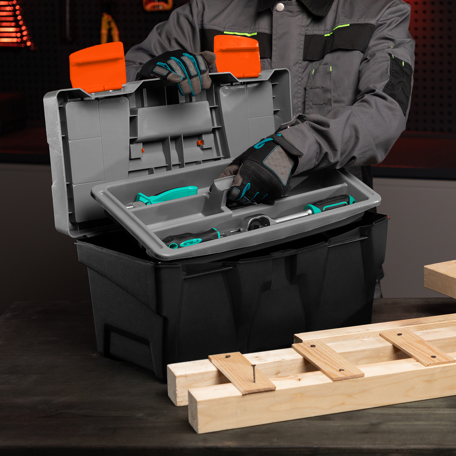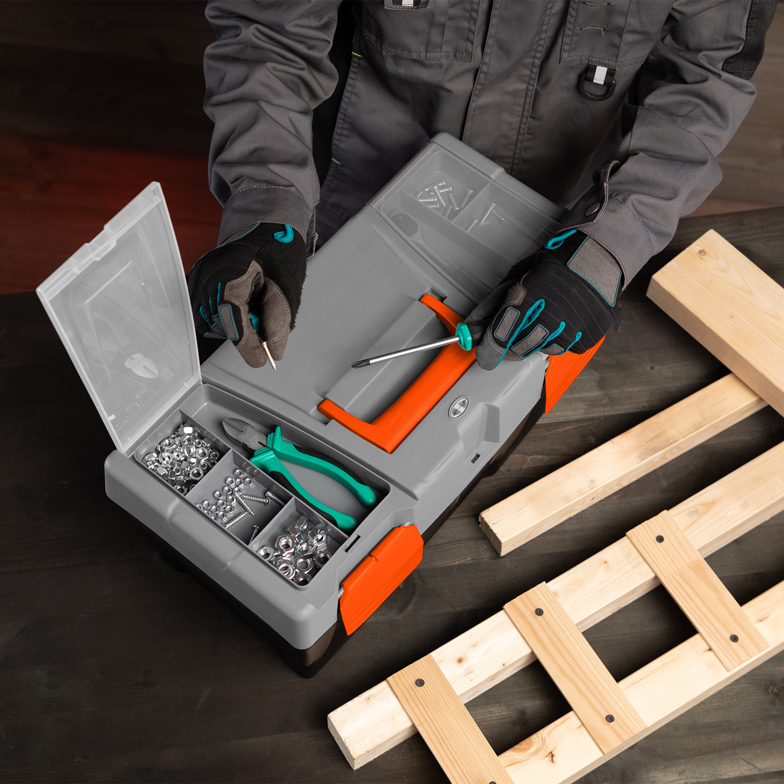 - В ящике имеется съемный лоток, что позволяет удобно расположить инструменты разного размера, а также крепежи и мелкие детали.