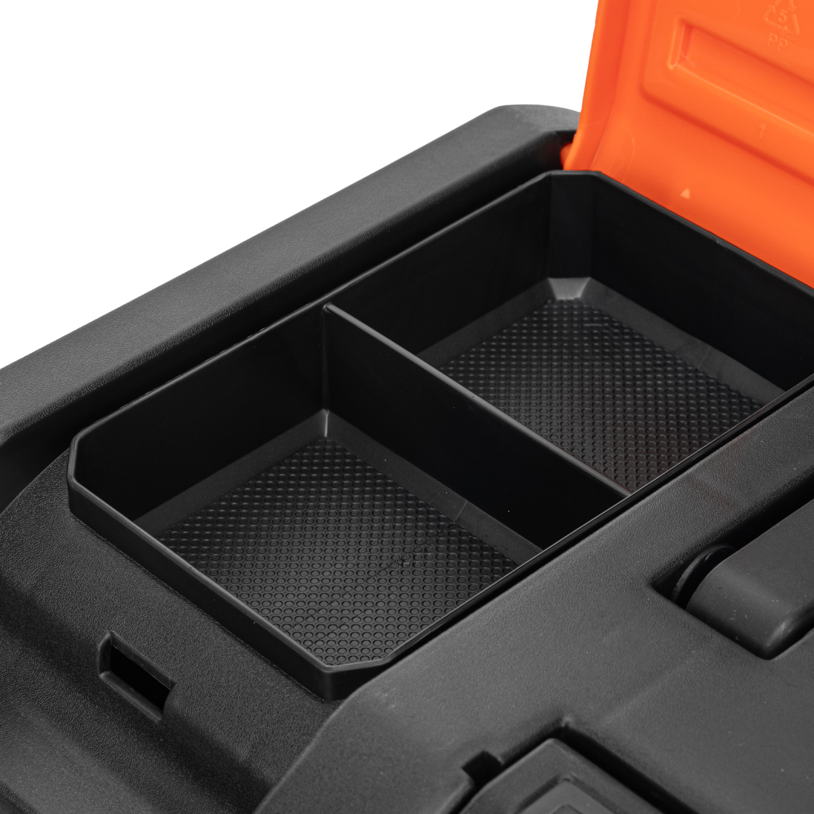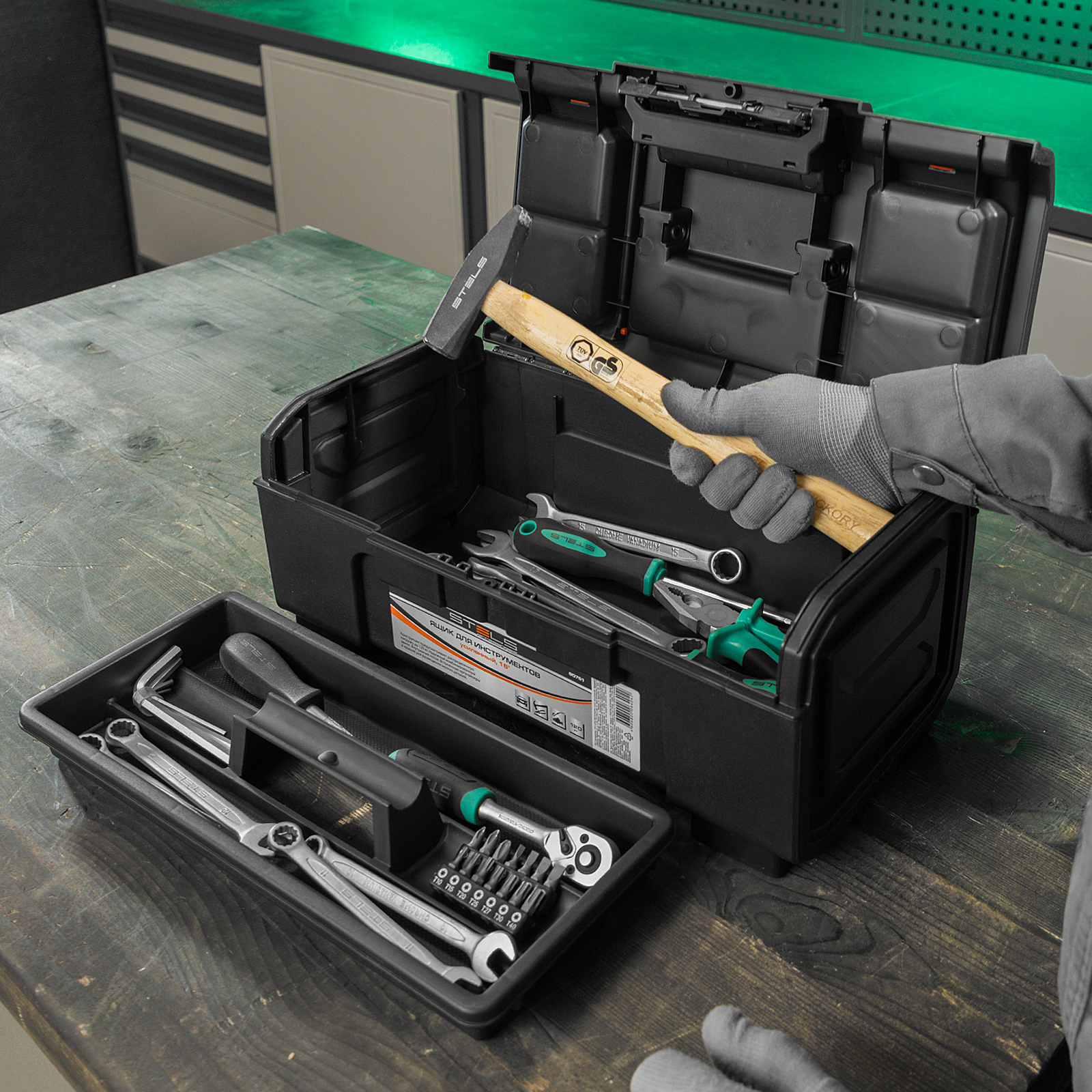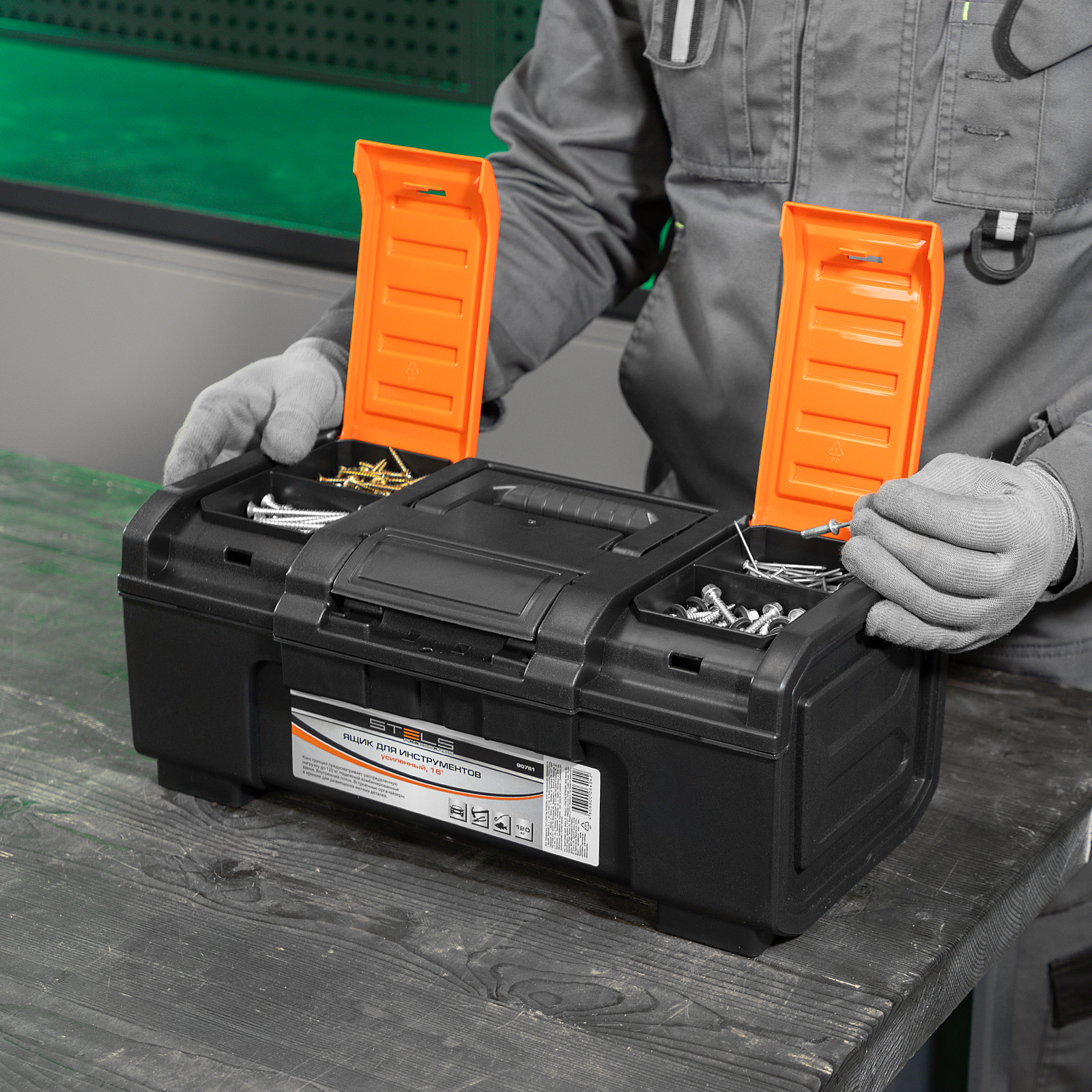 - Упорядоченное хранение крепежа и мелких деталей — в крышке имеются специальные органайзеры, также в комплект поставки входит съемный лоток с ручкой.
