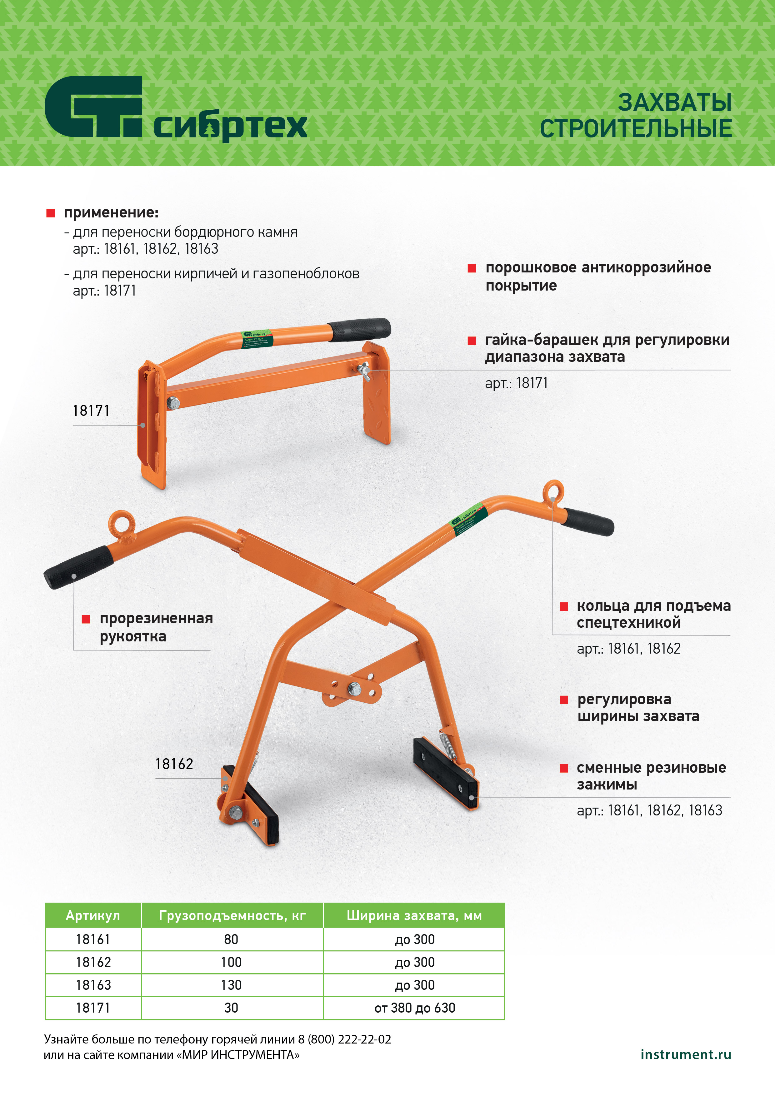 Ручной захват Сибртех 18171 подходит для перемещения всех видов кирпичей и строительных блоков (в том числе газо- и пеноблоков) шириной 380-630 мм. Пригодится частным мастерам и профессиональным строителям для выполнения работ по установке бордюрного камня и возведению зданий из кирпича.