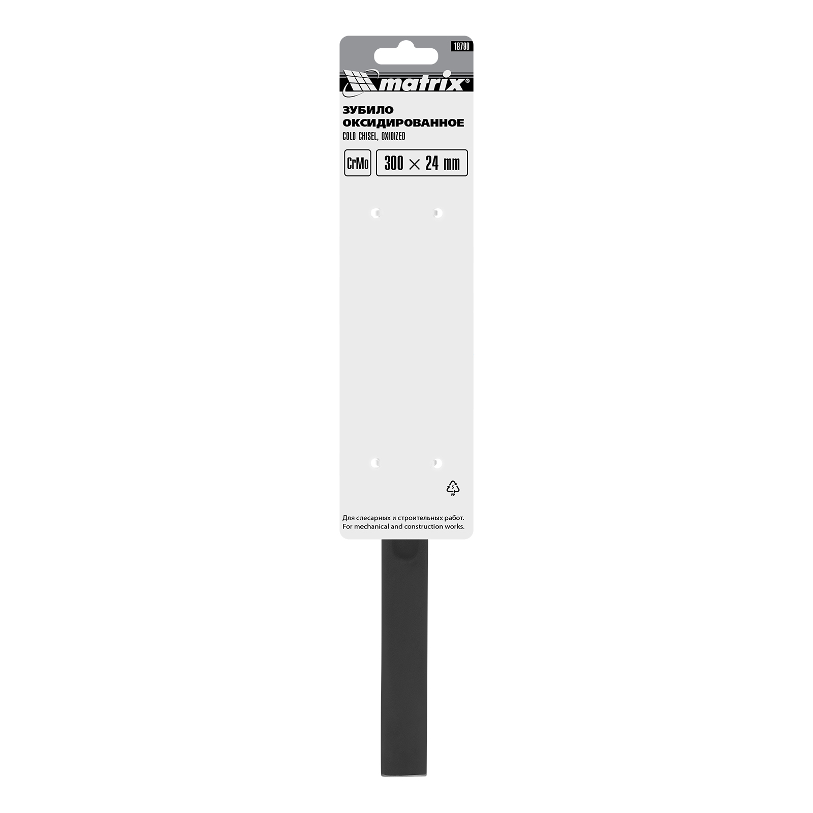 Оксидированное зубило Matrix 18790 размером 300 х 24 мм, из стали CrMo, — ударно-режущий инструмент для проведения слесарных и строительных работ с металлом, раскалывания кирпича, штробления бетона. Имеет одну из самых распространенных форм, что позволяет выдалбливать отверстия, вырубать закисшие крепежные элементы и даже создавать скульптуры.